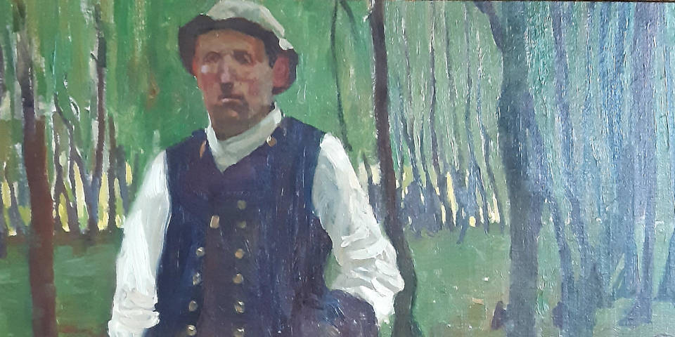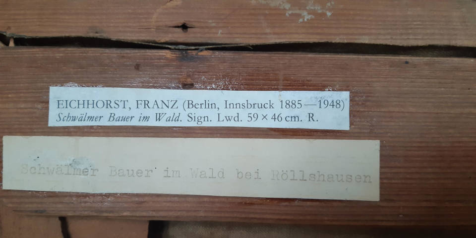 Lebendiges und gekonntes Gemälde eines Schwälmer Bauern im Wald von Franz Eichhorst (1885-1948), signiert unten rechts. Öl auf Leinwand, rückseitig alte Aufkleber. Größe: ca. 46×59 cm mit Rahmen etwa 70×80 cm.